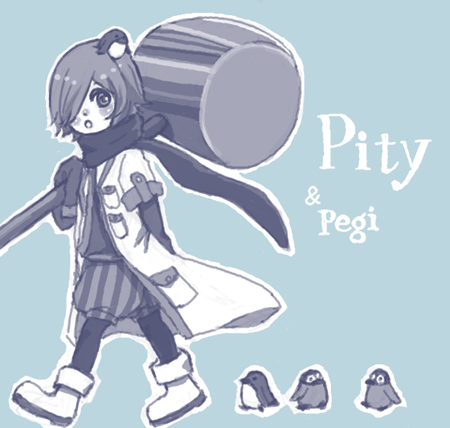 ペギーはピティの飼いペン。頭にいるやつ。手乗りペンギンは生まれたときからほとんど成長しないで、このサイズのままという設定です。ヒナもこのサイズ。そして卵もこのサイズ。なんて残念な成長速度。子育てが大変な親鳥。