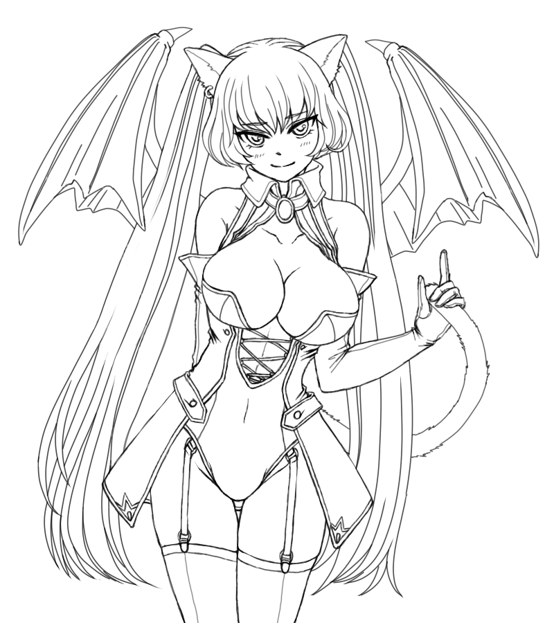 ユウキの本名の二次元女体化、「服はサキュバスみたいで、つり目で橙髪のロングのツインテールで猫耳+猫尾で乙女な感じのキャラ」の線画です。あと、おうし座流星群さんの二次元女体化の「服はセーラー服で、たれ目で黒髪のセミロングのツーサイドアップでエロエロで病んでる感じのキャラ」を今お絵描きさせてもらってるんですが…。
